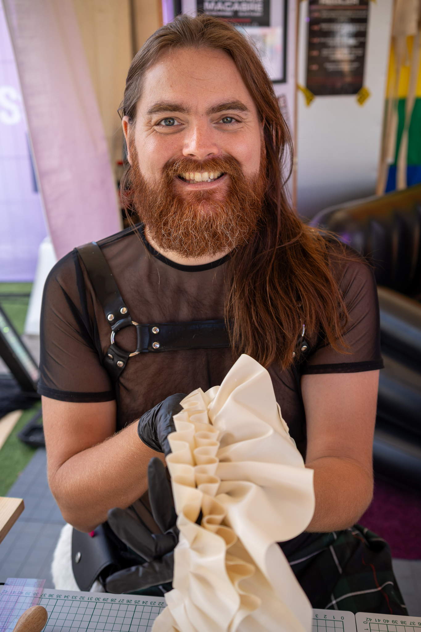 André Eldfogeln är skapare av Latexateljen och Ateljé Eldfogeln – en plats för gemenskap, kreativitet och kroppsnära utforskande. Som konstnär och hantverkare verkar André i gränslandet mellan material och människa, där latex, läder och konst möts. Genom sitt arbete formar han inte bara objekt, utan också sammanhang – trygga, hållna rum där deltagare får mötas genom material, kropp och närvaro.